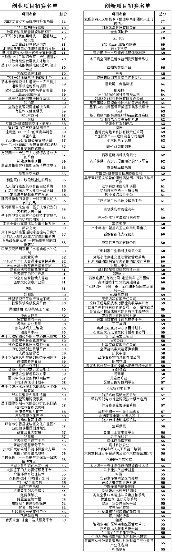 石家庄市创业创新大赛初赛名单